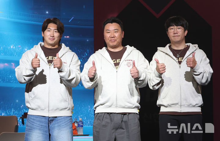[서울=뉴시스] 이영환 기자 = KIA 나성범(왼쪽부터), 이범호 감독, 양현종이 26일 서울 송파구 롯데호텔 월드에서 열린 2026 신한 SOL KBO리그 미디어데이에서 포즈를 취하고 있다. 2026.03.26. [email protected]