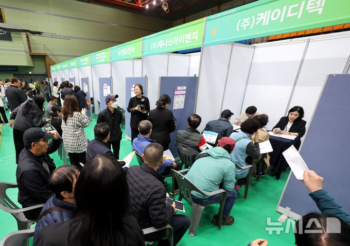 [광명=뉴시스] 박주성 기자 = 26일 오후 경기 광명시 광명시민체육관에서 열린 2026 광명시 일자리 박람회에서 구직자들이 면접을 기다리고 있다. 2026.03.26. [email protected]