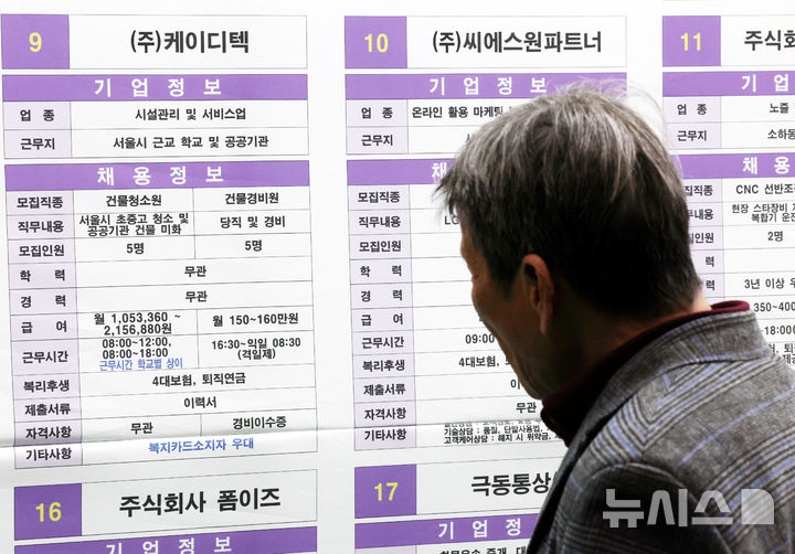 [광명=뉴시스] 박주성 기자 = 26일 오후 경기 광명시 광명시민체육관에서 열린 2026 광명시 일자리 박람회에서 구직자들이 채용게시대를 보고 있다. 2026.03.26. [email protected]