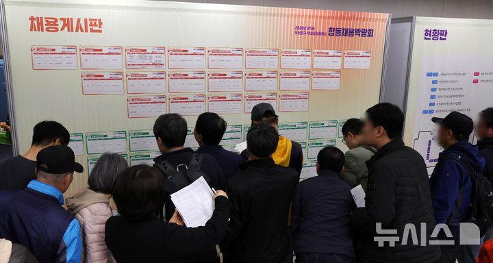 [부산=뉴시스] 하경민 기자 = 2026년 제1회 부산진구·부산상공회의소 합동 채용박람회가 열린 26일 부산 부산진구 부산상공회의소에서 구직자들이 채용업체 현황판을 살펴보고 있다.