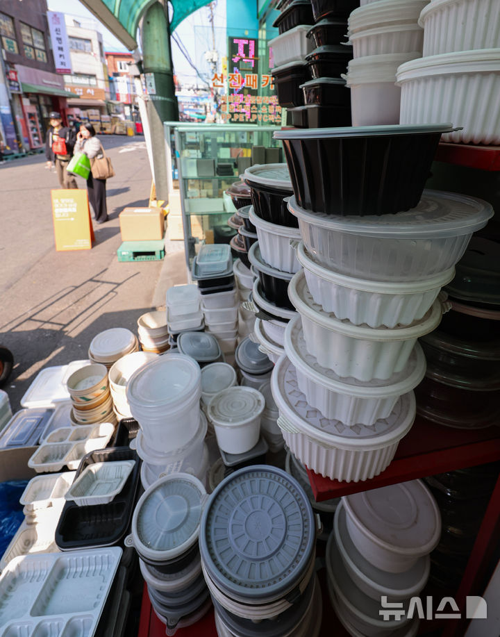 [서울=뉴시스] 권창회 기자 = 26일 서울 중구 방산시장 내 포장용기 가게에 포장용기가 진열되어 있다. 중동사태 여파로 석유화학 연료인 나프타 수급 차질이 생기면서 종량제봉투를 비롯한 비닐봉투, 포장용기 등 다양한 1회용품 포장재 품귀 우려가 커지고 있다. 이에 정부는 27일부터 나프타 수출통제를 실시한다. 2026.03.26. [email protected]