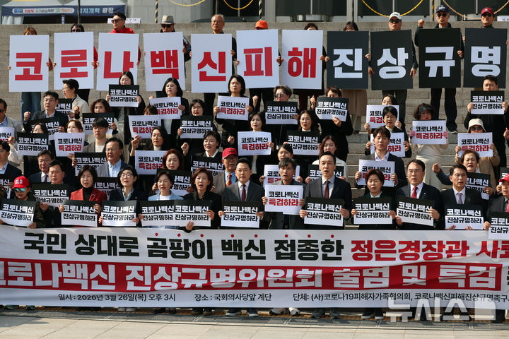 [서울=뉴시스] 고승민 기자 = 장동혁 국민의힘 대표 등 참석자들이 26일 서울 여의도 국회에서 열린 코로나백신 진상규명위원회 촉구 기자회견에서 구호를 외치고 있다. 2026.03.26. [email protected]