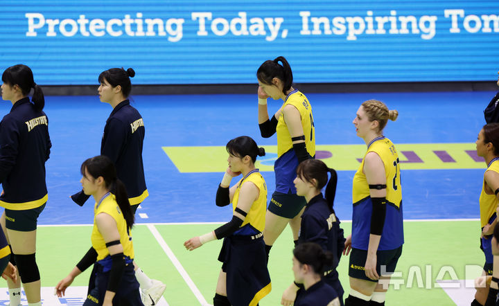 [수원=뉴시스] 조성우 기자 = 26일 경기 수원시 수원실내체육관에서 열린 2025~2026 V리그 여자부 플레이오프(PO) 1차전 현대건설과 GS칼텍스의 경기, 현대건설 선수들이 GS칼텍스에 1-3으로 패한 뒤 코트를 나서고 있다. 2026.03.26. [email protected]
