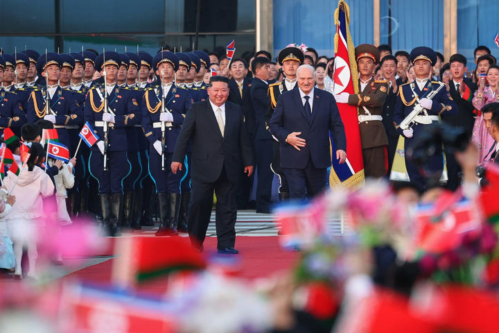 [평양=AP/뉴시스] 벨라루스 대통령실이 제공한 사진에 방북 일정을 마친 알렉산드르 루카셴코(오른쪽) 벨라루스 대통령이 26일 평양 순안국제공항에서 김정은 북한 국무위원장의 환송을 받고 있다. 2026.03.27.