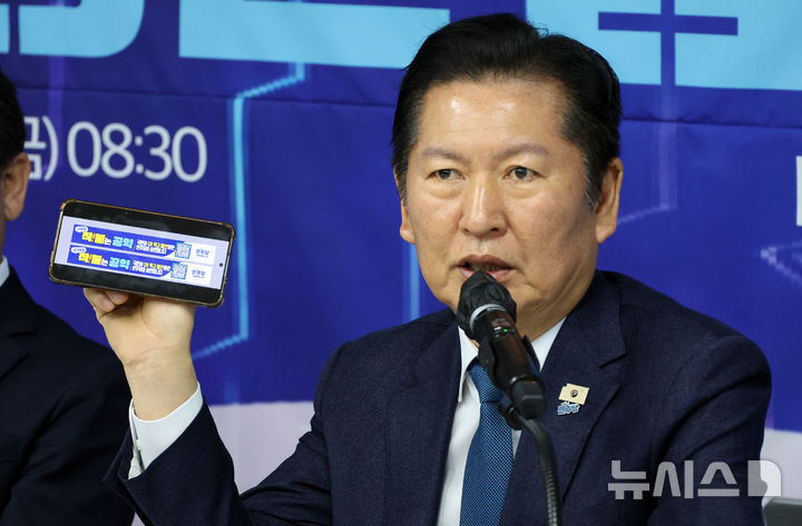 [세종=뉴시스] 강종민 기자 = 정청래 더불어민주당 대표가 27일 세종시 아름동 세종시당에서 열린 현장 최고위원회의에서 휴대폰을 들어보이며 발언하고 있다. 2026.03.27. [email protected]