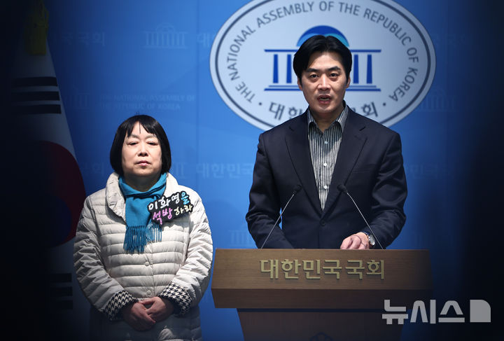 [서울=뉴시스] 김명년 기자 = 한준호 더불어민주당 의원이 27일 오전 서울 여의도 국회 소통관에서 이화영 전 경기도 평화부지사 배우자 백정화 씨와 함께 이 전 부지사 석방 촉구 기자회견을 하고 있다. 2026.03.27. [email protected]