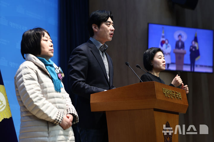 [서울=뉴시스] 김명년 기자 = 한준호 더불어민주당 의원이 27일 오전 서울 여의도 국회 소통관에서 이화영 전 경기도 평화부지사 배우자 백정화 씨와 함께 이 전 부지사 석방 촉구 기자회견을 하고 있다. 2026.03.27. [email protected]