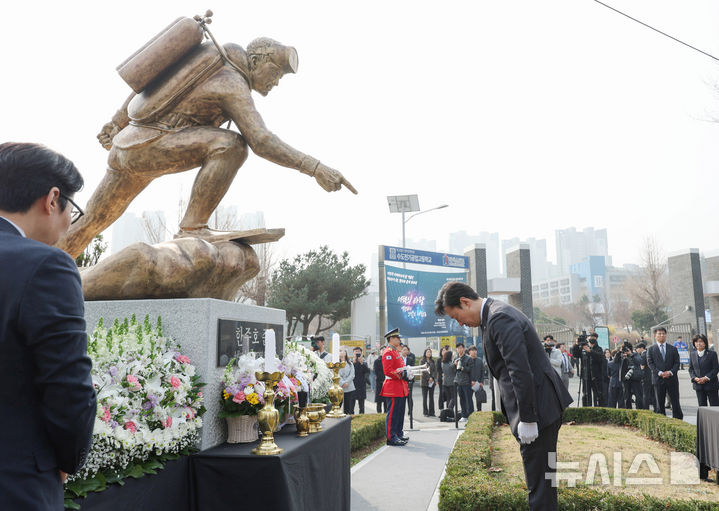 [서울=뉴시스] 김진아 기자 = 박수민 국민의힘 의원이 27일 서울 강남구 수도전기공업고등학교에서 열린 제11회 서해 수호의 날 기념식과 고 한주호 준위 16주기 추모식에서 한 준위 동상에 헌화 및 분향 후 묵념하고 있다. 2026.03.27. [email protected]
