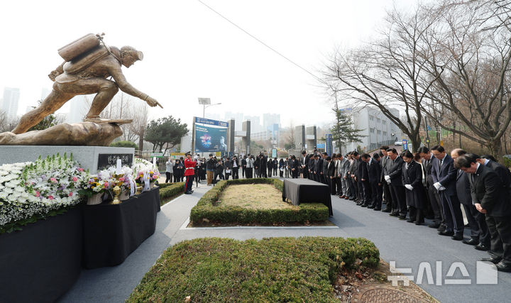 [서울=뉴시스] 김진아 기자 = 27일 서울 강남구 수도전기공업고등학교에서 열린 제11회 서해 수호의 날 기념식과 고 한주호 준위 16주기 추모식에서 참석자들이 한 준위 동상에 헌화 및 분향을 하고 있다. 2026.03.27. [email protected]