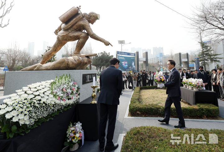 [서울=뉴시스] 김진아 기자 = 조성명 강남구청장이 27일 서울 강남구 수도전기공업고등학교에서 열린 제11회 서해 수호의 날 기념식과 고 한주호 준위 16주기 추모식에서 한 준위 동상에 헌화 및 분향을 하고 있다. 2026.03.27. [email protected]
