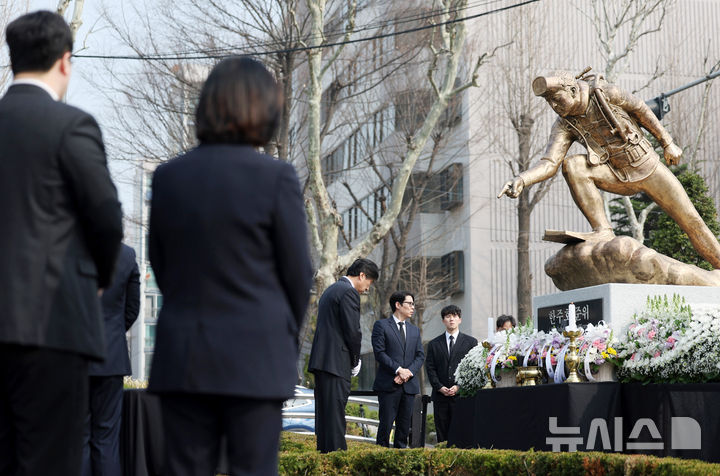 [서울=뉴시스] 김진아 기자 = 27일 서울 강남구 수도전기공업고등학교에서 열린 제11회 서해 수호의 날 기념식과 고 한주호 준위 16주기 추모식에서 참석자들이 한 준위 동상에 묵념하고 있다. 2026.03.27. [email protected]