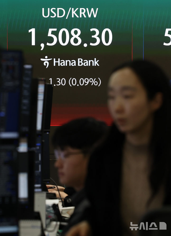 [서울=뉴시스] 이영환 기자 = 서울 외환시장에서 원·달러 환율이 전 거래일(1507.0원)보다 1.9원 오른 1508.9원에 주간 거래를 마감한 27일 오후 서울 중구 하나은행 딜링룸 전광판에 환율이 표시되고 있다. 2026.03.27. [email protected]