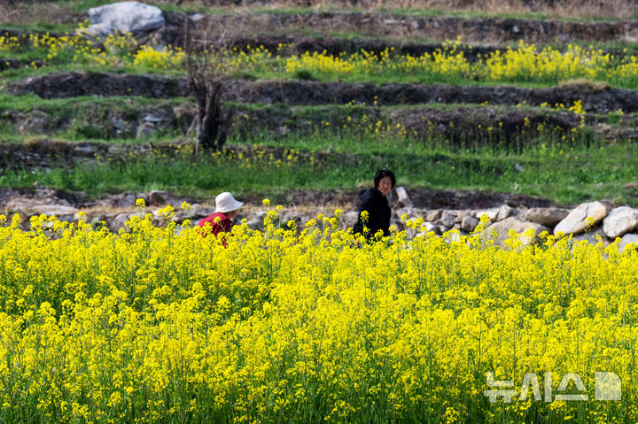 [남해=뉴시스] 차용현 기자 = 27일 오후 경남 남해군 상주면 두모마을 인근에 조성된 ‘파라다랑스’ 꽃별테마공원 내 층층이 쌓인 계단식 논에 유채꽃이 흐드러지게 피어 상춘객을 유혹하고 있다.2026.03.27. [email protected]