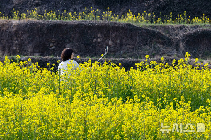 [남해=뉴시스] 차용현 기자 = 27일 오후 경남 남해군 상주면 두모마을 인근에 조성된 ‘파라다랑스’ 꽃별테마공원 내 층층이 쌓인 계단식 논에 유채꽃이 흐드러지게 피어 상춘객을 유혹하고 있다.2026.03.27. [email protected]