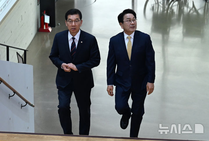 [목포=뉴시스] 박기웅 기자 = 더불어민주당 초대 전남광주특별시장 본경선 주자인 강기정 예비후보와 신정훈 예비후보가 27일 목포시 김대중노벨평화상기념관에서 후보 단일화에 대한 입장을 밝히기 위해 이동하고 있다. 2026.03.27. [email protected]