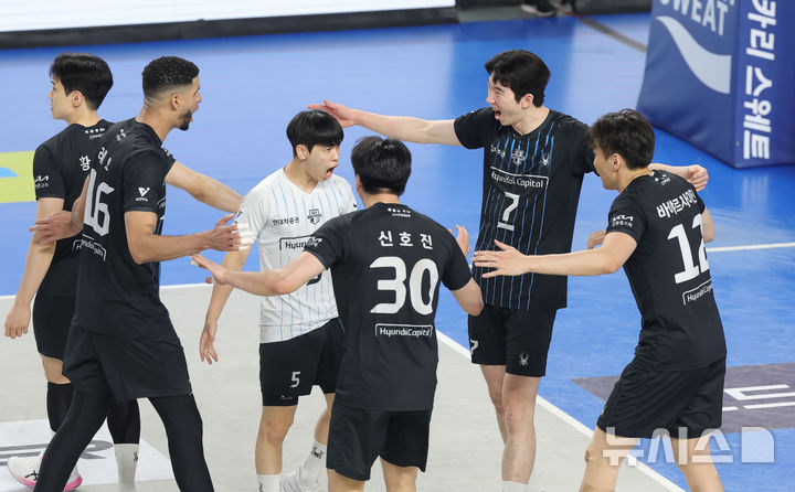 [천안=뉴시스] 홍효식 기자 = 27일 충남 천안 유관순체육관에서 열린 2025-2026 V-리그 남자부 플레이오프 1차전 현대캐피탈과 우리카드의 경기, 현대캐피탈 선수들이 득점에 기뻐하고 있다. 2026.03.27. [email protected]