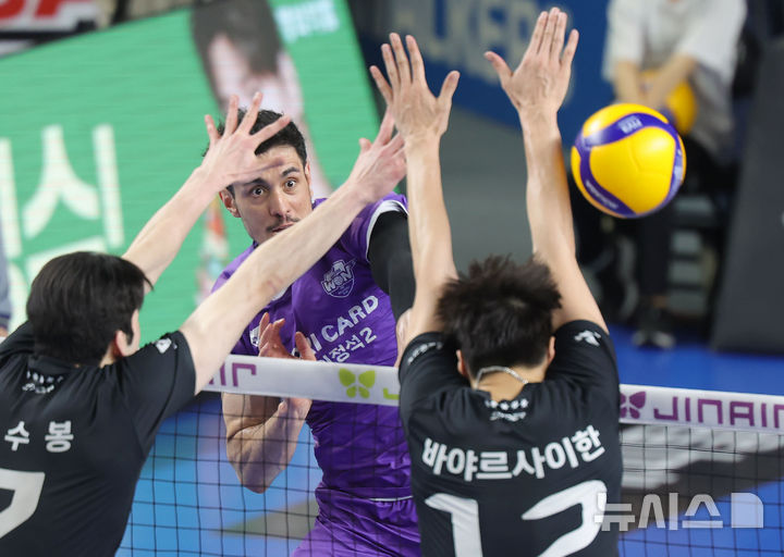 [천안=뉴시스] 홍효식 기자 = 27일 충남 천안 유관순체육관에서 열린 2025-2026 V-리그 남자부 플레이오프 1차전 현대캐피탈과 우리카드의 경기, 우리카드 아라우조가 공격하고 있다. 2026.03.27. [email protected]