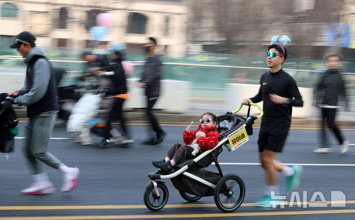 [서울=뉴시스] 이영환 기자 = 28일 오전 서울 종로구 광화문광장에서 2026 서울 유아차 런(Run) 행사 참가자들이 도착지인 여의도공원을 향해 달리고 있다. 2026.03.28. [email protected]
