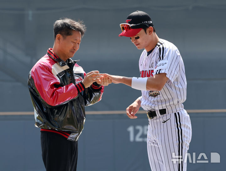 [서울=뉴시스] 배훈식 기자 = 2026 신한 SOL KBO리그가 개막한 28일 오후 서울 송파구 잠실야구장에서 김인석 LG스포츠 대표이사 사장이 지난 시즌 한국시리즈 우승 반지를 주장 박해민에게 끼워주고 있다. 2026.03.28. [email protected]