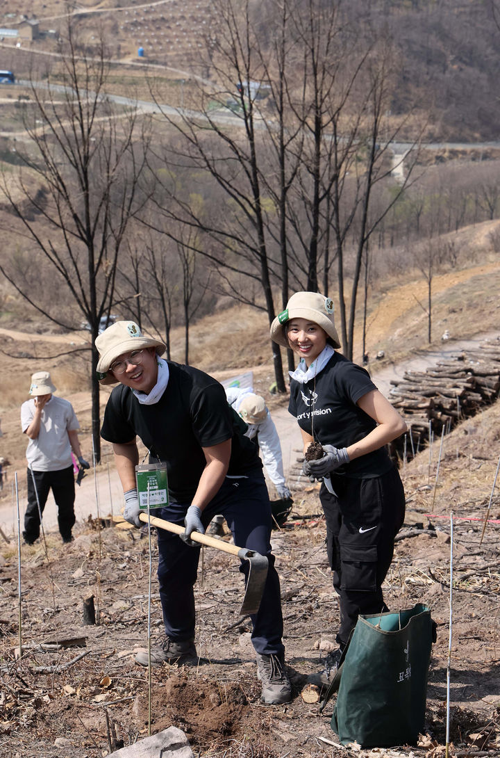 [서울=뉴시스] 이영환 기자 =  28일 경북 안동 산불피해지역에서 유한킴벌리가 주최한 '우리강산 푸르게 푸르게 2026 신혼부부 나무심기' 행사에서 참석자들이 나무를 심고 있다.