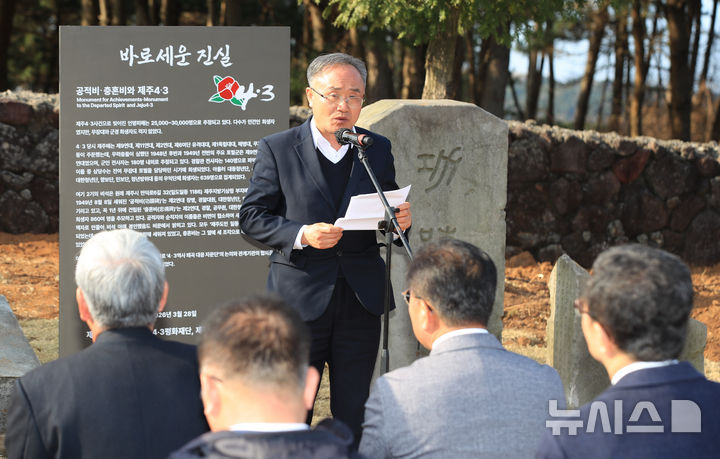 [제주=뉴시스] 우장호 기자 = 김창범 제주 4·3 희행자 유족회장이 28일 오후 제주 4·3평화공원 내에 함병선 공적비와 군경 공적비·충혼비를 이설하고 '바로 세운 진실' 안내판을 설치하는 행사에 참석해 발언하고 있다.