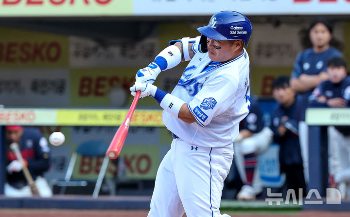 [대구=뉴시스] 이무열 기자 = 28일 대구 수성구 삼성라이온즈파크에서 열린 2026 신한 SOL KBO리그 개막전 롯데 자이언츠와 삼성 라이온즈 경기, 8회말 1사 주자 없는 상황에서 삼성 최형우가 안타를 치고 있다. 2026.03.28. [email protected]