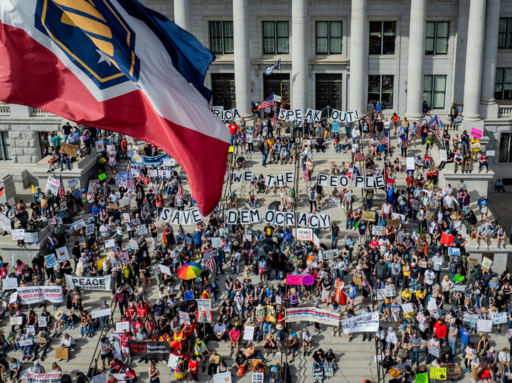 [솔트레이크시티=AP/뉴시스] 28일(현지 시간)솔트레이크시티 유타주 의사당 계단에서 ‘노 킹스’(No Kings) 시위 참가자들이 대형 피켓을 들고 구호를 외치고 있다. 이날 미국 전역에서 도널드 트럼프 대통령의 이란 전쟁에 반대하는 대규모 '노 킹스' 시위가 열렸다. 2026.03.29.