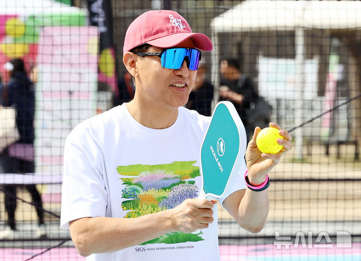 [서울=뉴시스] 최진석 기자 = 오세훈 서울시장이 29일 서울 강동구 광나루피클볼장에서 열린 한강공원 광나루 피클볼장 개장식에서 이벤트 경기를 하고 있다. 2026.03.29. [email protected]