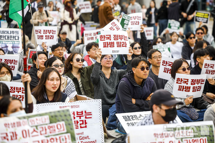 [서울=뉴시스] 정병혁 기자 = 29일 서울 종로구 열린송현광장에서 열린 '트럼프, 네타냐후의 전쟁에 반대한다' 땅의날 50주년 전국집중행동의날에서 참가자들이 구호를 외치고 있다. 2026.03.29. [email protected]