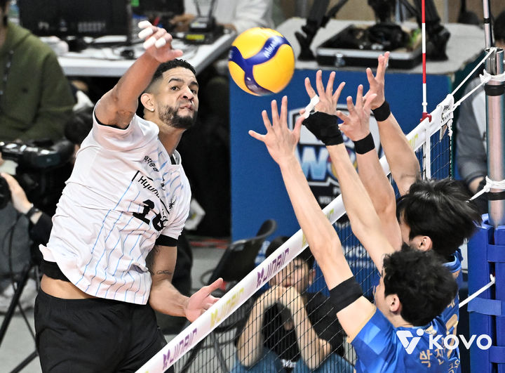 [서울=뉴시스] 조성우 기자 = 현대캐피탈이 29일 서울 장충체육관에서 열린 진에어 2025~2026시즌 V리그 남자부 PO 2차전에서 우리카드를 세트 점수 3-2로 꺾고 챔피언결정전에 진출했다. 현대캐피탈 레오가 스파이크 공격하고 있다. (사진=KOVO 제공) 2026.03.29. [email protected] *재판매 및 DB 금지