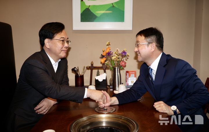 [서울=뉴시스] 조성봉 기자 = 한병도 더불어민주당 대표와 송언석 국민의힘 원내대표가 30일 서울 영등포구 한 음식점에서 회동을 하며 악수를 하고 있다. 2026.03.30. [email protected]
