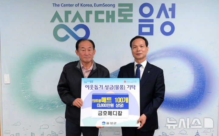 [음성=뉴시스] 이해준(왼쪽) 금호메디칼 대표이사와 조병옥 충북 음성군수가 30일 음성군청 집무실에서 의료용 매트 기탁식을 진행한 뒤 기념촬영을 하고 있다. (사진=음성군 제공) 2026.03.30. [email protected]