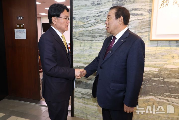 [서울=뉴시스] 조성봉 기자 = 황운하 조국혁신당 의원이 30일 오전 서울 여의도 국회에서 열린 국토위원회 국토법안소위원회에 앞서 최민호(오른쪽) 세종시장과 악수를 하고 있다. 이날 소위에서는 행정수도 관련 특별법안 등이 논의될 예정이다. 2026.03.30. [email protected]