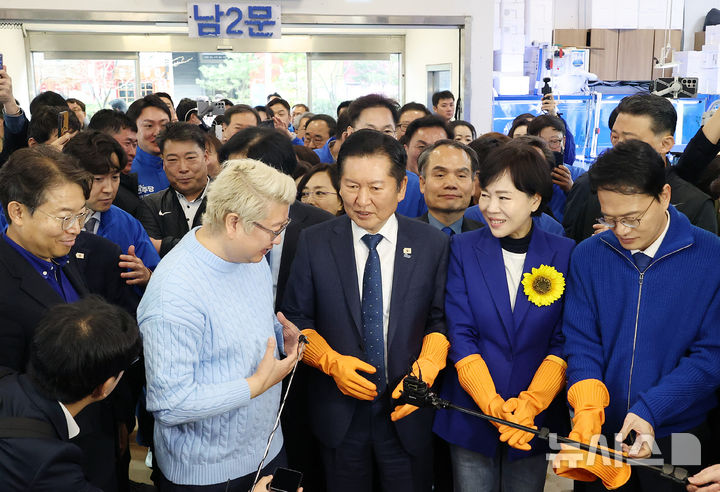 [서울=뉴시스] 정병혁 기자 = 정청래 더불어민주당 대표를 비롯한 서울시장 경선후보로 출마한 정원오, 박주민 전현희 후보가 30일 서울 동작구 노량진수산시장을 찾아 시장을 둘러보고 있다. (공동취재) 2026.03.30. [email protected]