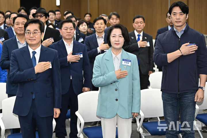 [수원=뉴시스] 김종택 기자 = 김동연(왼쪽부터), 추미애, 한준호 더불어민주당 경기도지사 경선후보가 30일 경기 수원시 경기도의회에서 열린 더불어민주당 경기도당 제3차 상무위원회에 참석해 국민의례를 하고 있다. 2026.03.30. [email protected]