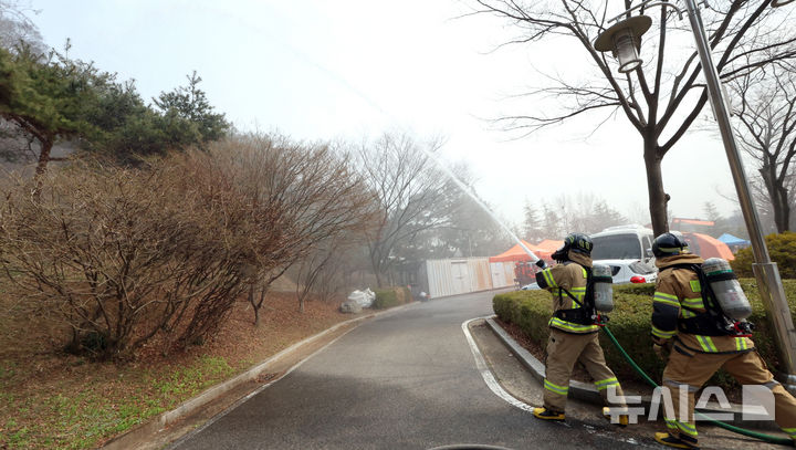 [인천=뉴시스] 전진환 기자 = 30일 오후 인천 중구 한국이민사박물관에서 실시된 2026년 봄철 인천시·중구 산불진화 합동훈련에서 소방대원들이 화재지역을 향해 방수하고 있다. 2026.03.30. [email protected]