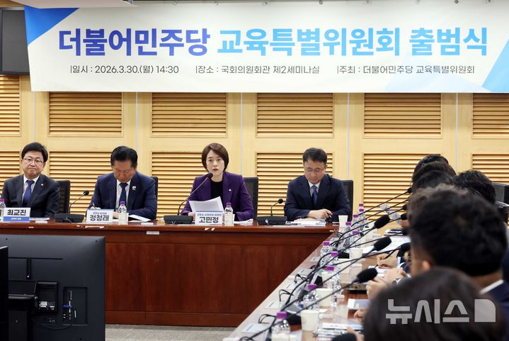 [서울=뉴시스] 조성봉 기자 = 고민정 더불어민주당 교육특위 위원장이 30일 오후 서울 여의도 국회 의원회관 세미나실에서 열린 더불어민주당 교육특별위원회 출범식에서 발언을 하고 있다. 2026.03.30. [email protected]