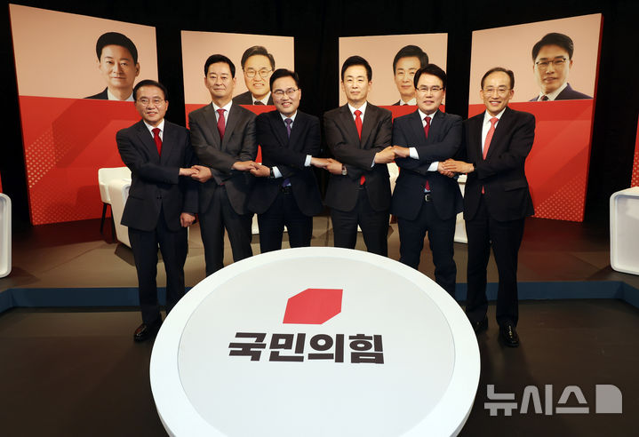 [대구=뉴시스] 이무열 기자 = 30일 오후 대구 수성구 TBC에서 열린 국민의힘 대구시장 후보 1차 비전 토론회에서 왼쪽부터 윤재옥·최은석·홍석준·유영하·이재만·추경호 후보가 기념촬영을 하고 있다. 2026.03.30. [email protected]