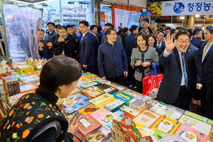 [서울=뉴시스] 최동준 기자 = 이재명 대통령과 김혜경 여사가 30일 제주 동문시장을 방문해 상인들과 인사하고 있다. (사진=청와대 제공) 2026.03.30. [email protected] *재판매 및 DB 금지