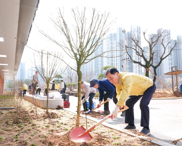 [홍성=뉴시스] 유효상 기자 = 충남도교육청 주관으로 31일 홍성군 홍주초등학교에서 탄소중립, 녹색 성장 실현을 위한 제81회 식목일 행사가 열린 가운데 김지철 교육감이 식재한 나무 주변을 다듬고 있다. (사진=충남교육청 제공) 2026.03.31 [email protected]