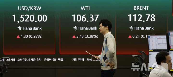 [서울=뉴시스] 김혜진 기자 = 서부텍사스산원유(WTI) 5월물은 배럴당 102.88달러로 2022년 7월 이후 처음으로 종가 기준 100달러를 넘어선 31일 서울 중구 하나은행 딜링룸 전광판에 지수가 표시 되고 있다.