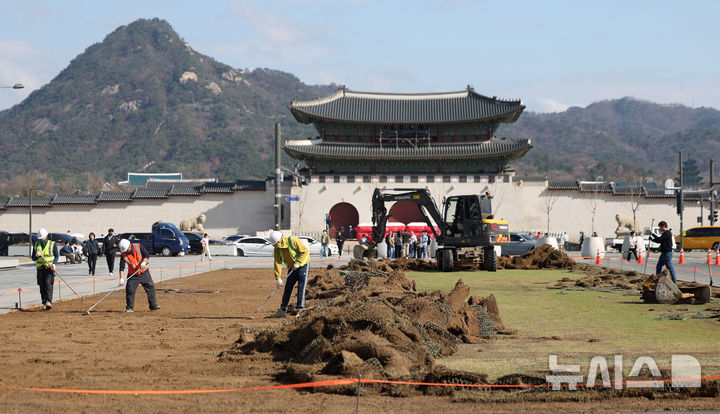 [서울=뉴시스] 김선웅 기자 = 31일 서울 종로구 광화문광장에서 봄맞이 겸 방탄소년단 공연 후 광장 잔디 원상복구 작업이 진행되고 있다. 2026.03.31. [email protected]