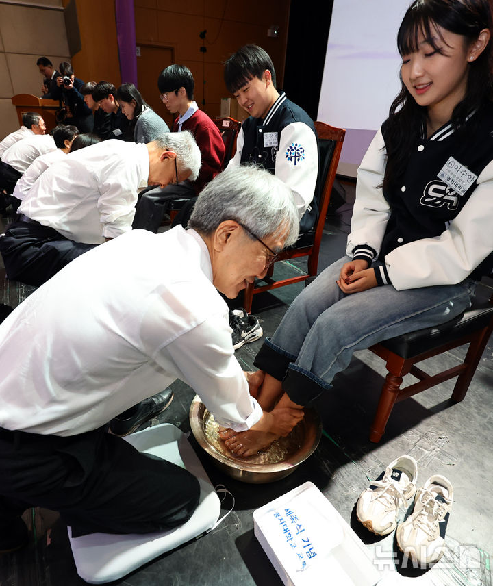 [서울=뉴시스] 최진석 기자 = 31일 서울 서대문구 명지대학교에서 열린 '2026학년도 수난절 기념 세족식'에서 임연수 명지대 총장을 비롯한 교수들이 제자들의 발을 직접 씻겨주고 있다.