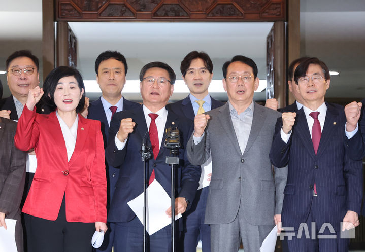 [서울=뉴시스] 김명년 기자 = 김대식 의원 등 부산 지역구 국민의힘 의원들이 31일 오후 서울 여의도 국회 로텐더홀에서 부산 글로벌허브도시 특별법 관련 기자회견을 열고 구호를 외치고 있다. 2026.03.31. [email protected]