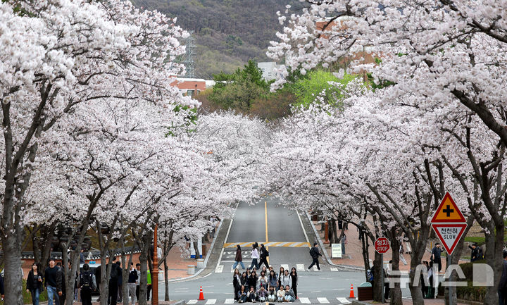 [대구=뉴시스] 이무열 기자 = 포근한 봄 날씨를 보인 31일 대구 달서구 계명대학교 성서캠퍼스에서 학생들이 만개한 벚꽃 배경으로 사진을 찍고 있다. 2026.03.31. [email protected]