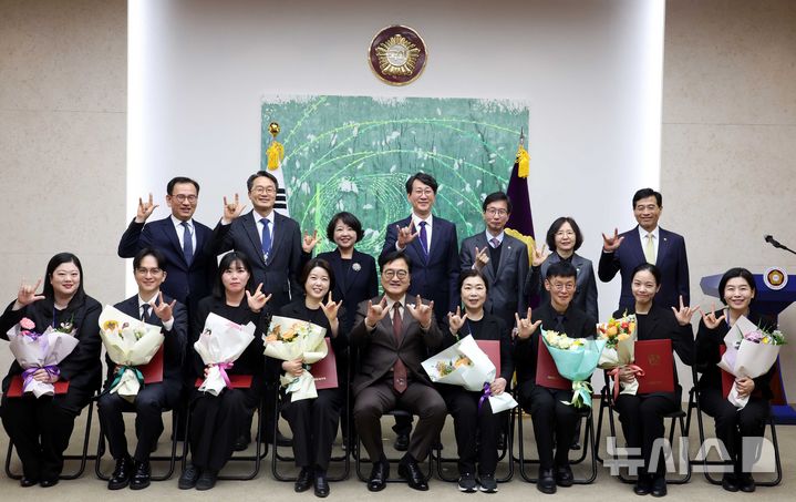 [서울=뉴시스] 조성봉 기자 = 우원식 국회의장이 31일 서울 여의도 국회에서 열린 국회 수어통역사 임명장 수여식에서 참석자들과 기념촬영을 하고 있다. 직접고용된 수어통역사들은 국가공무원법에 따른 국가공무원 신분으로, 국회 기자회견과 본회의 실시간 중계 등 다양한 의정활동 현장에서 수어통역을 제공한다. 2026.03.31. [email protected]