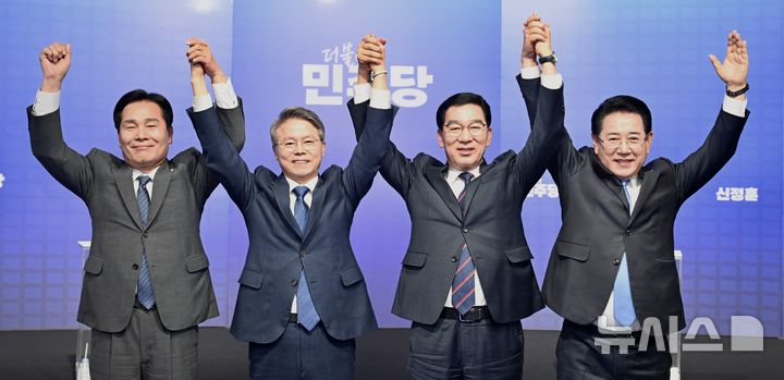 [광주=뉴시스] 이현행 기자 = 31일 오후 KBS광주방송총국 공개홀에서 더불어민주당 전남광주통합시장 본경선 토론회가 열리기 전 후보들이 손을 맞잡고 공정한 토론을 다짐하고 있다. 왼쪽부터 주철현·민형배·신정훈·김영록 후보. 2026.03.31. [email protected]
