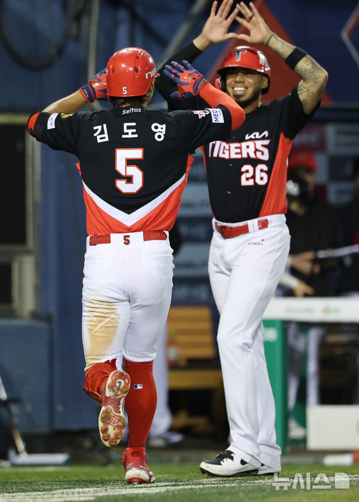 [서울=뉴시스] 김진아 기자 = 31일 오후 서울 송파구 잠실야구장에서 열린 2026 KBO리그 KIA 타이거즈와 LG 트윈스의 경기, 2회초 2사 2루 KIA 김도영이 투런 홈런을 친 뒤 더그아웃으로 들어오며 카스트로와 기뻐하고 있다. 2026.03.31. [email protected]