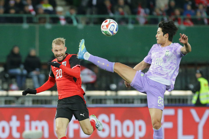 [빈=AP/뉴시스] 설영우가 지난달 31일(현지 시간) 오스트리아 빈의 에른스트 하펠 스타디움에서 열린 오스트리아와 평가전 중 공을 다투고 있다. 한국이 0-1로 패해 북중미 월드컵 이전 A매치 2연전에서 2패를 기록했다. 2026.04.01.