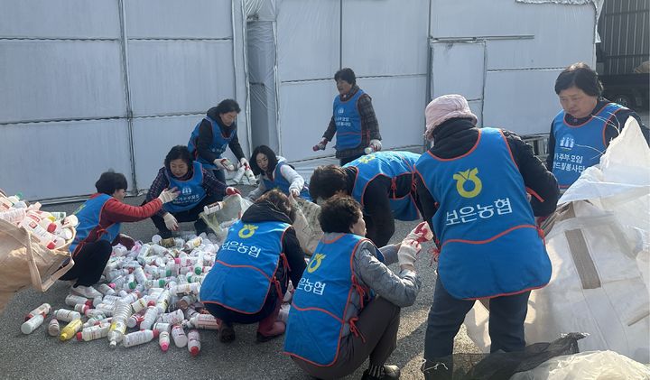 [보은=뉴시스] 환경정화 활동에 나선 충북 보은농협 농가주부모임 회원들이 1일 보은읍 성족리 동학공원 일원에서 생활쓰레기와 농경지 주변에 버려진 폐비닐, 농약용기 등을 수거한 후 분리배출하고 있다. (사진=보은농협 제공) 2026.04.01. [email protected]